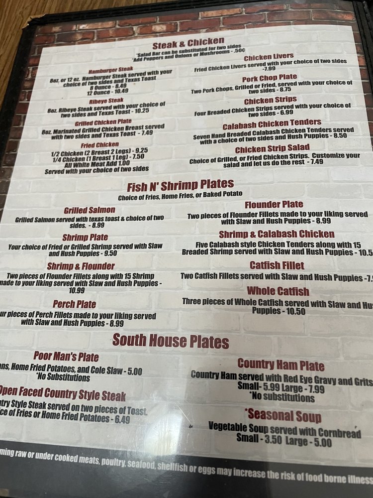 South House Restaurant in Greer, SC offers a true taste of Southern home cooking with its generous portions and changing daily menu. Known for their mouth-watering pork chops, vegetable beef soup, and Saturday night special NY strip steak, this cozy country restaurant has won the hearts of many customers. With options for takeout, delivery, and reservations, South House provides a welcoming atmosphere for groups and families. The affordable prices and delicious dishes like cherry pie and cornbread have kept patrons coming back for more. The friendly staff and quick service enhance the dining experience, making every visit a memorable one. If you're craving comfort food that feels like a warm hug, South House Restaurant is the place to be.